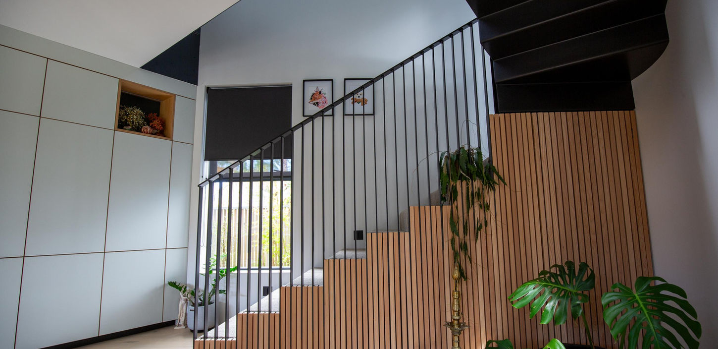 A curved transition in the stair presented a rewarding design challenge, resolved through careful detailing to ensure the solid steel components aligned seamlessly. On Level 1, a striking folded steel balustrade features laser-cut vertical slots, adding sharp geometry and visual interest.