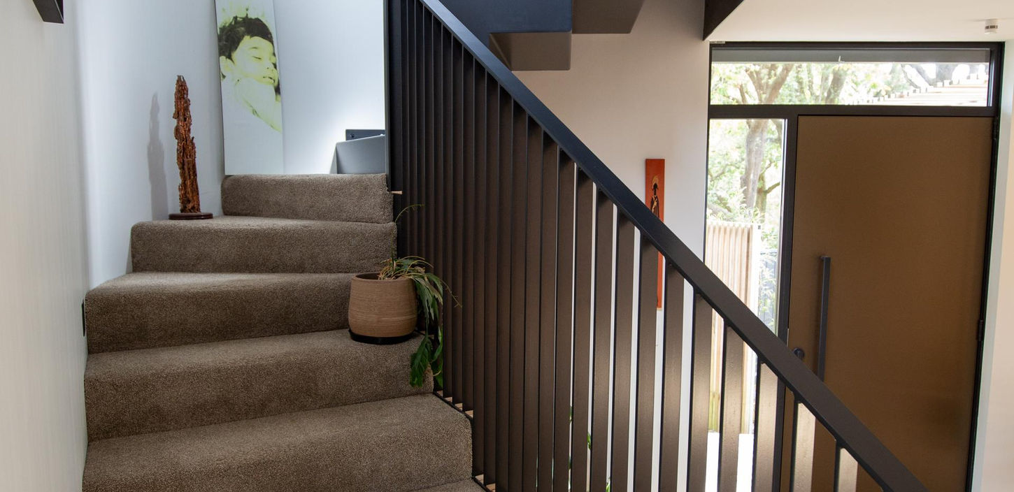 The stair features solid steel treads on the top five steps, transitioning into a carpeted stair run that adds comfort and safety underfoot. At the base, a flat bar balustrade is paired with a bespoke timber infill, creating a unique rhythm of texture and detail.